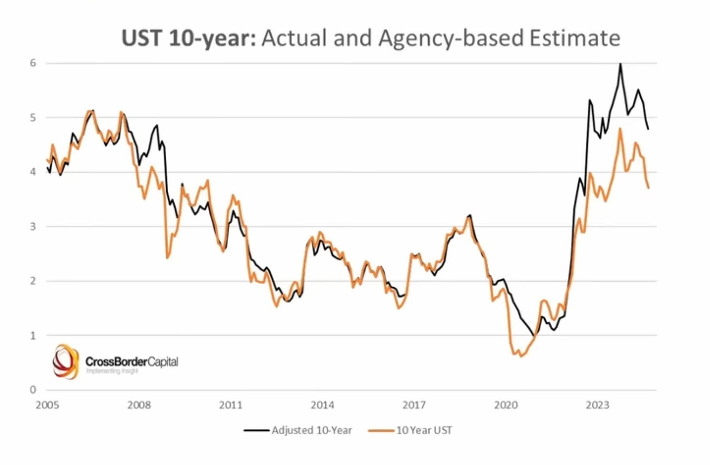 So it’s the wrong price? What’s up with that? CrossBorder Capital is an awesome follow on twitter and the substack and has a great visual showing where a synthetic estimate of the 10 year yield is expected to be - basically 1% higher than it is. - 5%