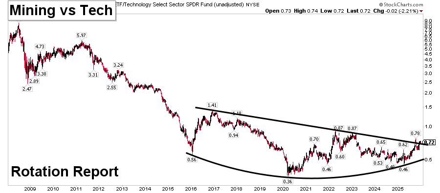 Which brings us to Miners vs Tech trying to complete a decade long bottom. This is as big a portfolio shift as we could imagine. Tech companies would have big problems while the metals are in shortage? Yeah that might do it.
